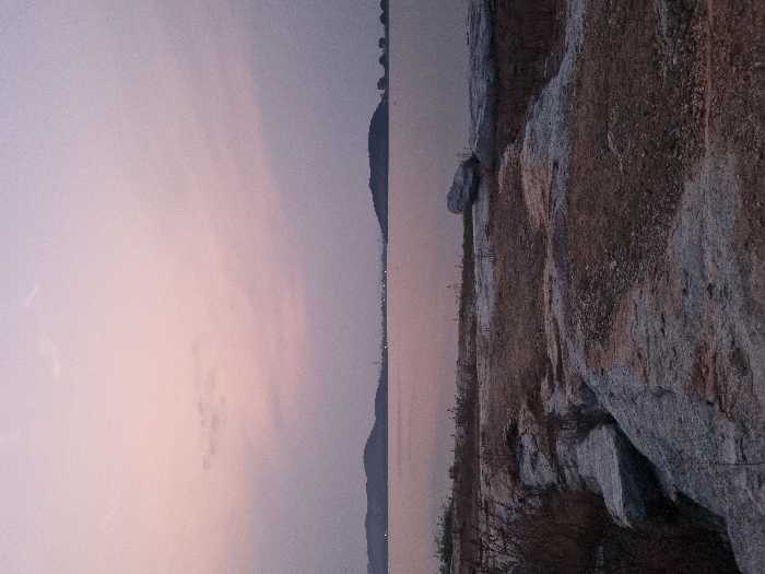 The image depicts a tranquil, unpopulated natural landscape at dusk or dawn in Kammavaripalli, India. The sky, occupying the upper two-thirds of the frame, displays gradients of muted pink, lavender, and soft grey, with sparse, indistinct cloud formations. A large, calm body of water occupies the middle ground, its surface reflecting the subtle colors of the sky and extending horizontally across the frame. In the distant background, a silhouette of low-lying hills or mountains is visible, stretching across the horizon. A faint line of distant lights or structures is discernible above the water, near the horizon line. The foreground consists of rough, uneven terrain characterized by large, light grey boulders and exposed earth with patches of dry, sparse vegetation. The ground cover appears to be a mix of dirt and small stones. No individuals, animals, or man-made structures are immediately present in the foreground or midground.