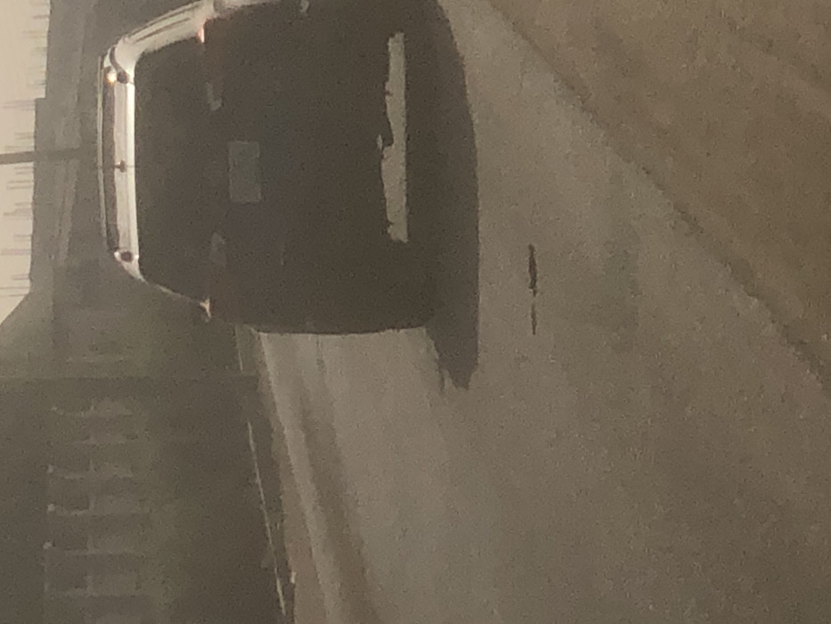 The image depicts a low-light, grainy outdoor scene on a paved road in Hanwa, Nigeria. A dark-colored sport utility vehicle (SUV) is the primary subject, viewed from its rear, positioned on the asphalt surface, angled slightly to the right. The SUV features roof rails; its license plate is present but illegible due to resolution and lighting. A horizontal light-colored strip is visible on the lower rear bumper. Dark marks or debris are scattered on the road surface directly behind the vehicle, which casts a shadow. To the left of the paved road, a lighter-colored unpaved shoulder is visible. In the background, a dark building or wall with multiple rectangular openings is partially discernable on the left, alongside a vertical pole. The far background shows a hazy area with faint vertical structures, possibly rebar or distant infrastructure. No individuals are visible. No explicit actions or interactions are discernible; the vehicle appears stationary or moving slowly away from the vantage point.