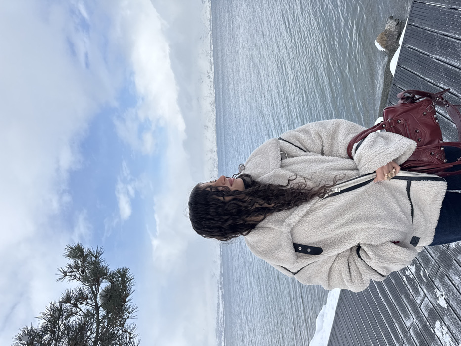 A single female subject stands on a partially snow-covered wooden deck beside a large body of water in Tsamakaberd, Armenia. She is positioned slightly right of the frame's center, with her head turned to the right, observing the distant landscape. She has long, dark, curly hair and is wearing a cream-colored, textured, oversized jacket with black trim, a zippered front, and a collar featuring a black strap and silver-toned buckle. Dark trousers or jeans are visible beneath the jacket. Her left hand holds a dark red, studded handbag with silver-toned hardware; rings are visible on her fingers. A pine branch with needles and small cones, dusted with snow, extends into the upper left corner of the frame. The body of water, likely Lake Sevan, displays ripples on its surface. The background features snow-covered mountains or hills partially obscured by low-hanging clouds or mist. The sky is partially cloudy with visible patches of blue. The scene depicts a cold, wintery environment.