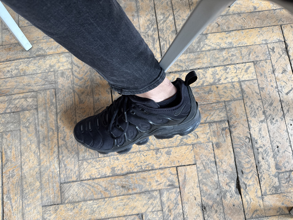 The image displays a close-up, high-angle view of a person's lower left leg and foot resting on a distressed wooden parquet floor. The specific location within Plovdiv, Bulgaria, cannot be determined from the visual information. The individual is wearing dark, possibly black or very dark grey, denim jeans that are slightly cuffed or rolled at the ankle. A pale-skinned ankle is exposed, revealing a faint, linear scar approximately 2-3 cm long on the lateral aspect. The foot is clad in a black Nike Air Max Plus TN sneaker, characterized by its all-black colorway, glossy wavy synthetic overlays, and visible air cushioning units in the sole. A slender, light grey or silver-colored metal leg of a chair is visible diagonally behind the person's leg on the right side of the frame. The floor is composed of rectangular wooden planks laid in a herringbone pattern, exhibiting significant wear, discoloration, and some minor cracks or chips, indicative of age and use. Soft shadows are cast by the foot and leg on the floor.