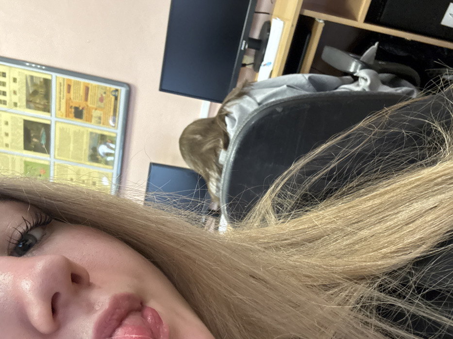The image depicts an indoor scene, likely within an educational institution in Saint Petersburg, Russia. The foreground features a partial, close-up view of a woman's face on the left side of the frame, showing blonde hair, a visible left eye, and an open mouth with an extended tongue. In the mid-ground, a second individual, with long brown hair, is seen from behind, seated in a dark office chair and leaning forward towards a desk. This person is wearing a light grey long-sleeved top. The background includes two dark computer monitors with inactive screens positioned on wooden desks, and a framed informational poster containing multiple sections of text and images displayed on a light pink wall. The precise location within Saint Petersburg is not discernible from the visual information provided.