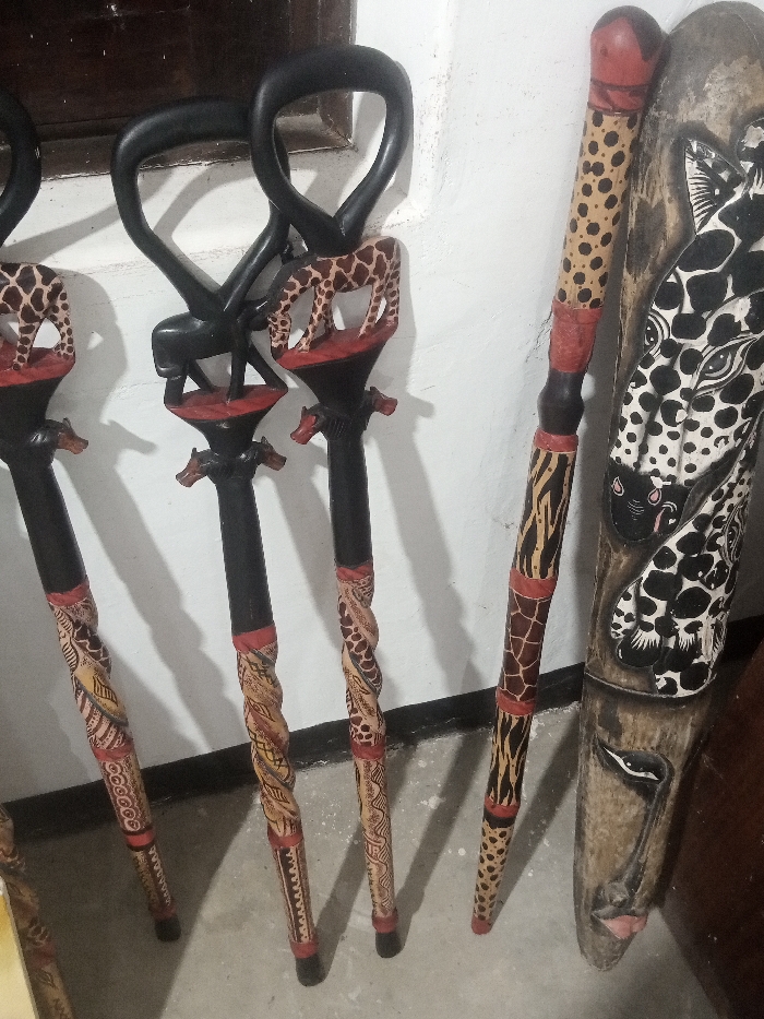 A static, medium-shot photograph taken within the Makadara/Mji Wa Kale ward, Kenya, depicts a display of handcrafted wooden artifacts. Four carved wooden staffs and a decorative wooden plank lean vertically against a textured white wall, with a light grey floor visible at the base. The three leftmost staffs share a common design: a dark, stylized, looping handle surmounts a dark wooden shaft. Immediately below the handle, each staff features a carved, light brown giraffe with dark spots, depicted in a grazing posture on a reddish-brown platform. Further down, smaller reddish-brown animal head carvings encircle the shaft. The lower shafts are characterized by sections of lighter wood intricately carved with spiraled, geometric, and animal-skin patterns in reddish-brown and black. The fourth staff, positioned to the right of the three similar ones, displays a different motif. Its shaft features segments of a light tan background with dark brown leopard-like spots, interspersed with reddish-brown bands and a section of black and light tan zebra stripes. To the far right, a tall, irregularly shaped wooden plank leans against the wall. Its upper portion exhibits two stylized animal heads with black and white spotted patterns. The lower section of this plank is carved into a human face mask with an elongated nose, narrow eyes, and prominent reddish-pink lips. No individuals are present in the scene. The lighting is diffused, illuminating the items against the plain white wall and grey floor.