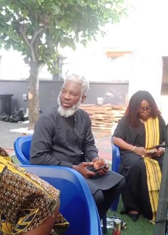 n outdoor gathering of people. Three individuals are visible in the frame, seated in blue plastic chairs. A man with a long grey beard and grey hair is in the center, wearing a black outfit and looking at his smartphone. To his right is a woman in a black dress with a yellow and gold shawl. She is also looking at her phone. To the left of the man, a woman wearing a yellow and brown patterned outfit is partially visible. There's a tree providing some shade. Behind them, there is a white wall and some stacked wooden planks. Empty drink cans are scattered on the ground. The background suggests a residential setting. The audio features upbeat music.