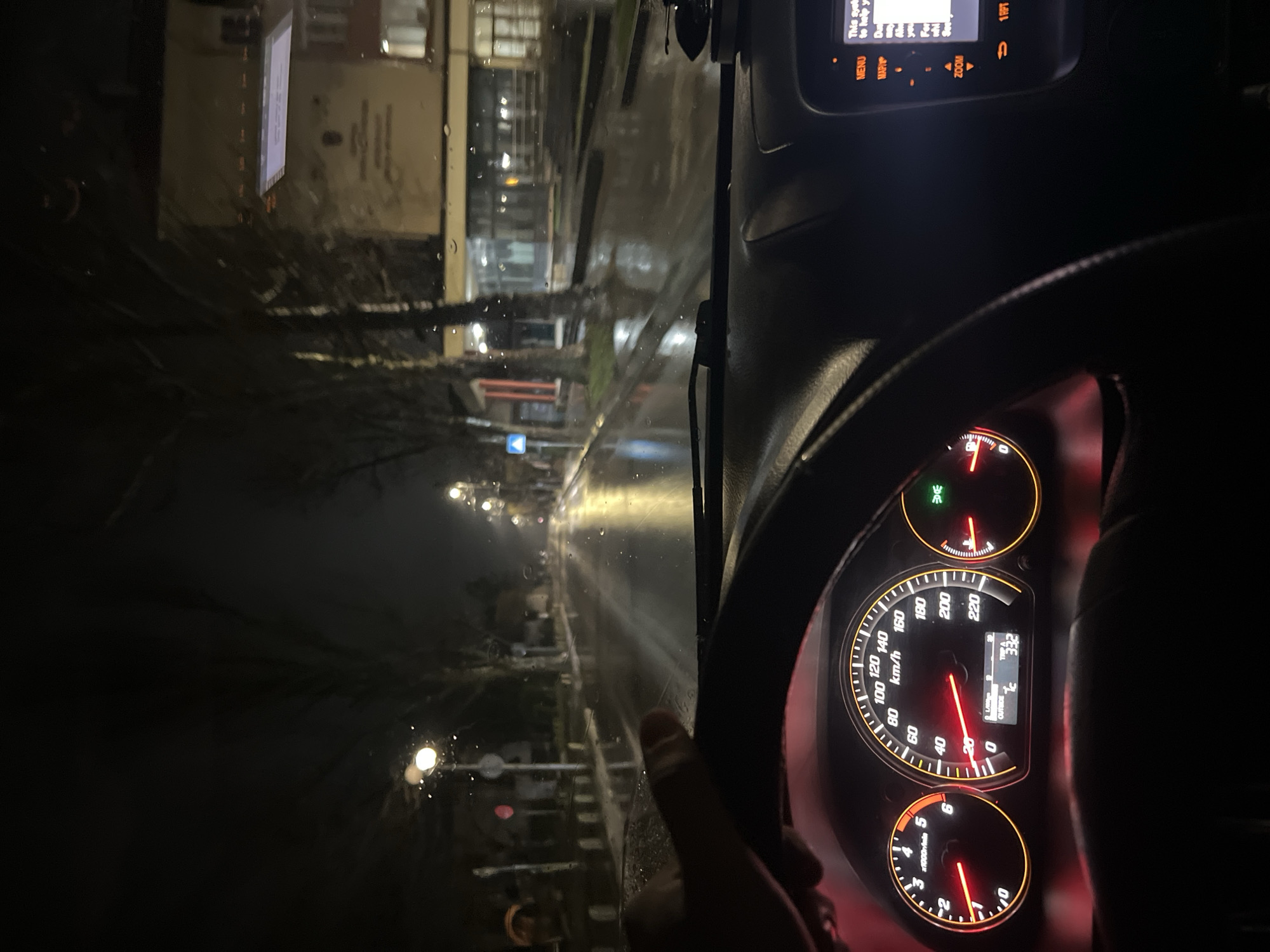 The image depicts a nighttime scene from the interior of a stationary or slow-moving vehicle on a wet street in Dolna Mitropolia, Bulgaria