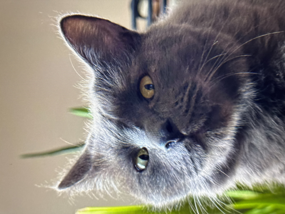 - "This is a close-up, headshot photograph of an adult domestic short-haired cat with dense, dark gray fur and prominent white whiskers" by FM-8Emg02, licensed under CC BY 4.0