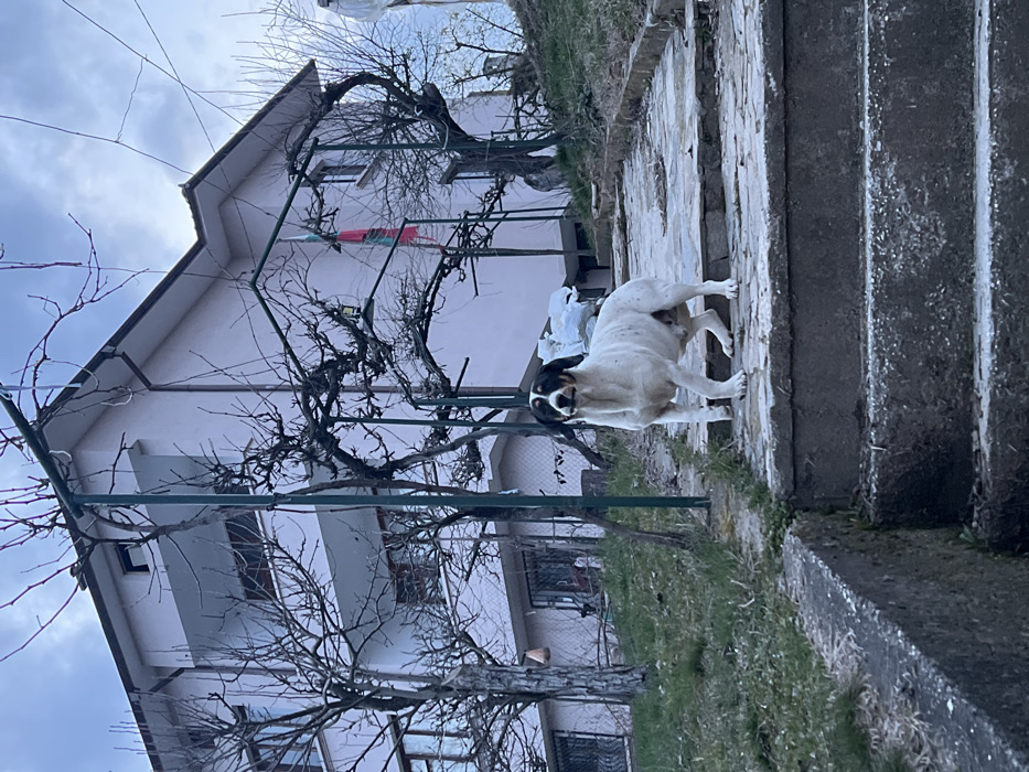 This image depicts an outdoor residential scene in the city of Paspal, Bulgaria, under an overcast sky. A white dog with black patches on its head and ears stands centrally on a stone-paved pathway that ascends towards a multi-story, light-pinkish-white house in the background. The dog is positioned mid-stride, facing the viewer with its mouth slightly ajar. Bare, gnarled tree branches, possibly part of a vine or fruit tree, frame the scene, supported by a green metal trellis system. A Bulgarian flag, distinguished by its vertical white, green, and red stripes, hangs from the facade of the house on the right side. The ground surrounding the pathway consists of sparse grass and exposed soil. Concrete steps are visible in the foreground, leading up to the stone pathway where the dog stands.