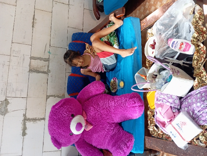 A girl in a pink top and denim shorts reclines on a blue cushion sofa with a phone in her hand. A large purple teddy bear rests beside her. A brown wooden side table with a patterned edge holds assorted items including a plastic bag, cosmetics, tissues, and containers. The floor is tiled with light-colored blocks. The scene suggests a casual, indoor setting with a mix of comfort and clutter.