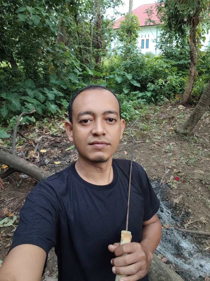 A male individual, appearing to be in his 30s with short dark hair, a light mustache, and a small goatee, is depicted from the chest up, centered in the frame. He is wearing a plain black short-sleeved t-shirt and looks directly at the camera. His right hand holds a metal rod with a light-colored, possibly bamboo or wooden, handle; the rod has a curved or hooked end extending upwards. The scene is outdoors in Jurong Pante, Indonesia. The immediate foreground consists of dirt ground covered with fallen leaves, twigs, and patches of charred debris or ash. A thick, fallen log lies horizontally on the left side of the foreground. The midground and background are dominated by dense green foliage, including large-leafed plants and various trees. Partially visible through the foliage in the upper right background is a light-colored building with a red-tiled roof and at least two dark, rectangular window-like openings.