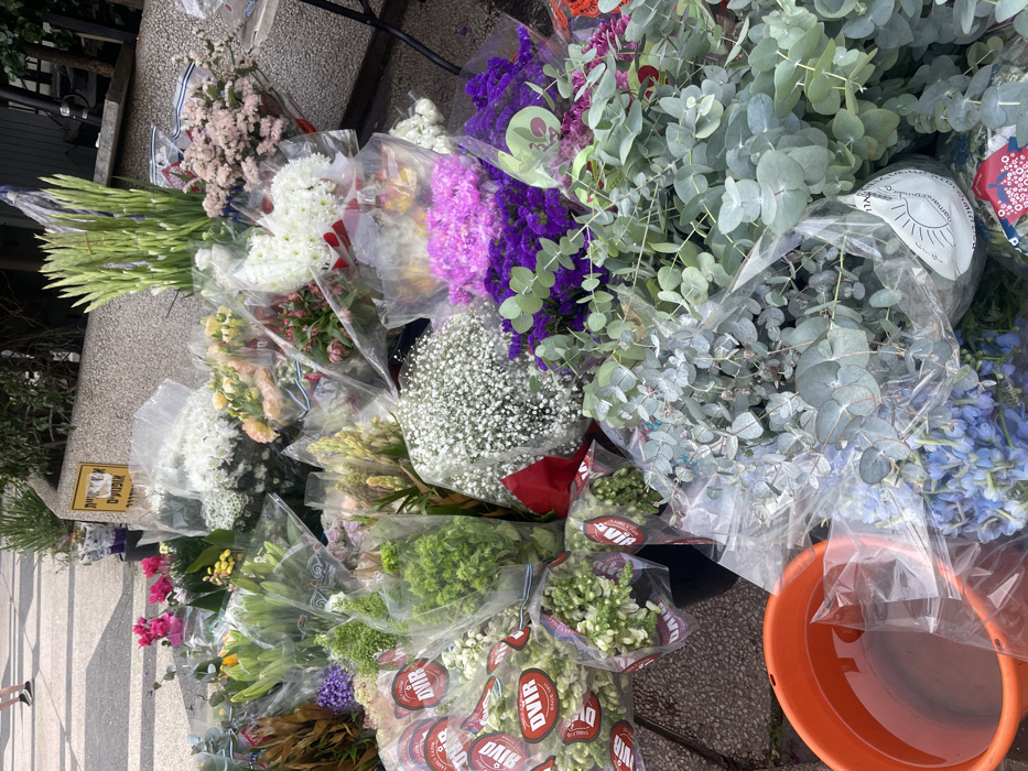 A vibrant display of diverse flowers and foliage fills the frame. Bunches of eucalyptus with silvery-green leaves mingle with bouquets of white baby's breath, purple statice, and blue delphiniums. Green gladioli stand tall, while lilies, chrysanthemums, and other colorful blooms in shades of pink, white, and yellow add to the floral abundance. The flowers are mostly wrapped in clear plastic, and an orange bucket filled with water sits nearby.