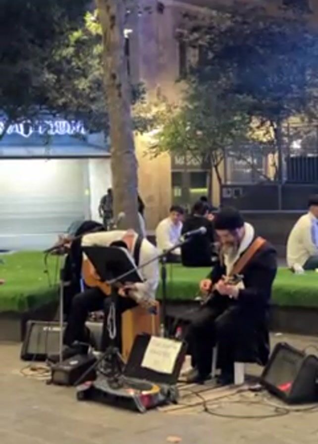 At night in an outdoor urban setting, two men are playing music as street performers for an audience. The musicians, seated on chairs, are dressed in traditional Hasidic Jewish clothing, including black hats and long black coats. One man plays an acoustic guitar and sings into a microphone, while the other plays a mandolin. They are surrounded by musical equipment including amplifiers and a tip jar. Behind them, a group of young men are seated on an artificial turf area, watching and listening. The background features buildings with lit signs and trees.