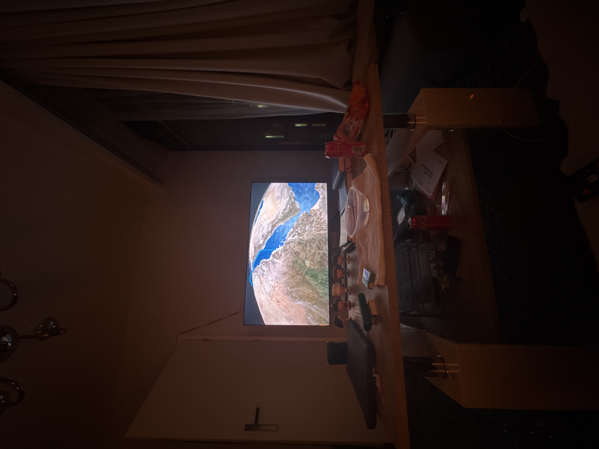 The image displays an interior room, identified as a residential space within Warsaw, Poland, captured during low-light conditions consistent with evening or night. A large, wall-mounted television or monitor is centrally positioned, displaying a geographical satellite image featuring an arid, brownish landmass sharply divided by a distinct blue body of water, visually consistent with the Red Sea area. In the foreground, a rectangular wooden coffee table or media console is laden with various objects. From left to right, a dark, flat object, possibly a closed laptop or electronic device, rests on the table's edge. A black remote control lies closer to the television. Immediately below the television screen, a row of five small, stylized collectible figures is arranged. To the right of these figures, a packet of green and white cigarettes is positioned next to a light-colored, possibly soiled, cloth or towel. A clear plastic bowl, a red aluminum beverage can, and an open bag of orange and red snack food are also present on the tabletop. A dark-bound book is partially visible behind the snack bag. Below the main table surface, on a lower shelf, various papers are discernible, including one document with the legible Polish text "Prawo budow..." (indicating "Building Law"), which corroborates the specified Polish location. Another red aluminum beverage can is also visible on this lower shelf. To the left of the television, a light-colored interior door with a dark, horizontal handle is partially visible. To the right, a window is mostly obscured by beige or light-colored pleated curtains, through which faint, vertical lights from an external building or streetscape are visible, suggesting an urban environment. A dark-colored, multi-bulb ceiling light fixture is partially visible at the top of the frame. No individuals are present within the scene.