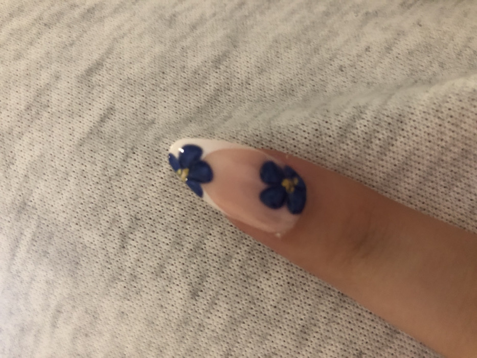 The scene is located in Saverne, France. The image presents a close-up, top-down view of a single human finger, likely an index or middle finger, resting on a light grey, subtly textured fabric surface. The fingernail is elongated and almond-shaped, adorned with a clear-to-pink base French manicure and a white free edge. Two distinct blue floral designs, each featuring a small yellow center, are applied to the nail: one is positioned towards the tip and the other closer to the cuticle. The fabric background exhibits a consistent, fine woven texture.