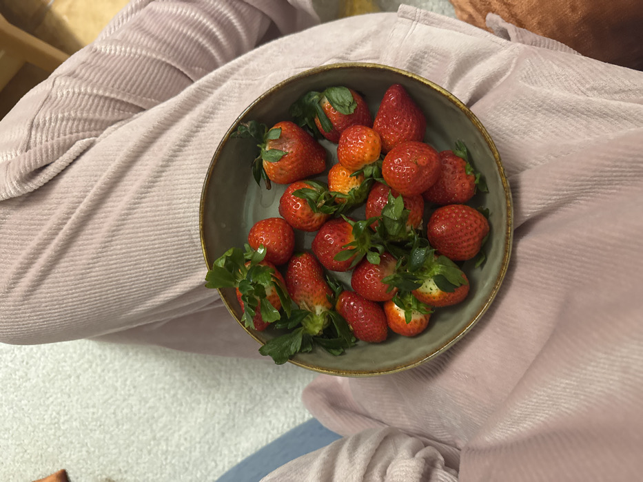 A light green-grey ceramic bowl, featuring a dark brown or gold rim, is centrally positioned and holds approximately two dozen red strawberries. The strawberries vary in ripeness, with most appearing fully red and several displaying lighter, orange-red areas. Many retain their green leafy caps and stems. The bowl rests on the lap of an individual, who is wearing light pink or lavender corduroy trousers, identifiable by their distinct vertical ridges. In the upper left background, a segment of light blue fabric, possibly part of another person's clothing or a blanket, is partially visible. The surrounding background is out of focus, revealing a light-colored, textured surface to the upper left and a warmer-toned, possibly wooden or textile surface to the upper right. A section of dark brown or orange fabric is present at the lower right edge of the frame. The scene is situated indoors, in Miljevci, Montenegro.