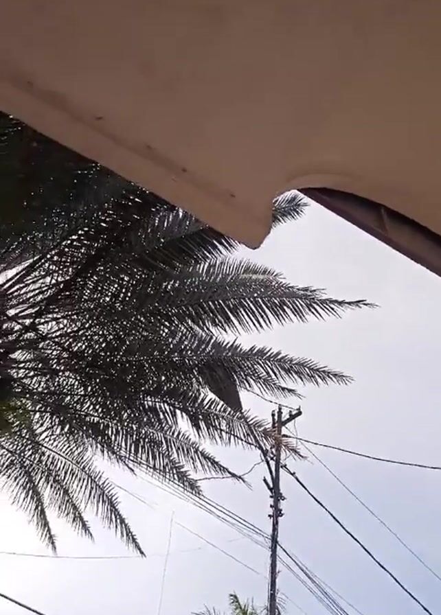 The camera, positioned under an awning, shows a tall palm tree with visible fronds and a ridged trunk, slightly silhouetted against the bright, overcast sky