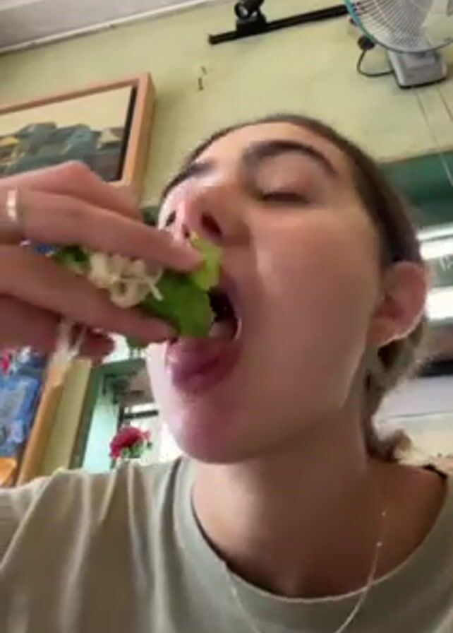 A young woman eats something green. She is fair-skinned, with brown hair in a low ponytail, and wears a light green shirt and silver necklace. She takes a large bite of the green food, chews, and swallows. The background features framed artwork on a light green wall, a white fan attached to the wall, and a shelf with a framed certificate.