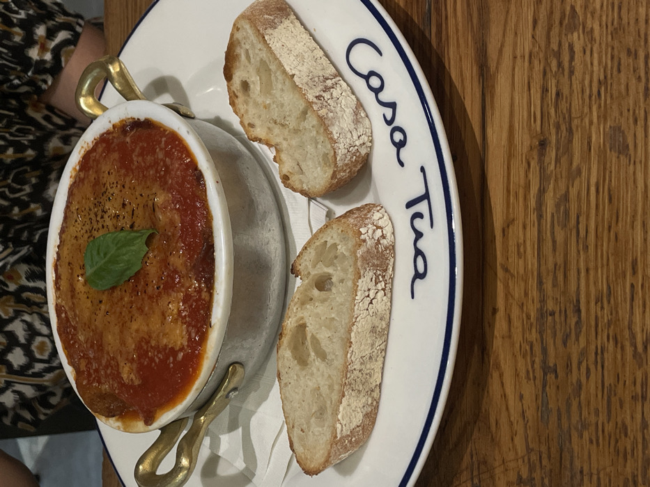 A white plate with a blue rim and the inscription "Casa Tua" holds a small, oval-shaped dish with golden handles. The dish contains a tomato-based dish topped with melted cheese and a single basil leaf. Two slices of crusty bread are placed on the plate next to the dish. The plate rests on a wooden surface, and a person wearing a patterned top is visible on the left side of the frame.