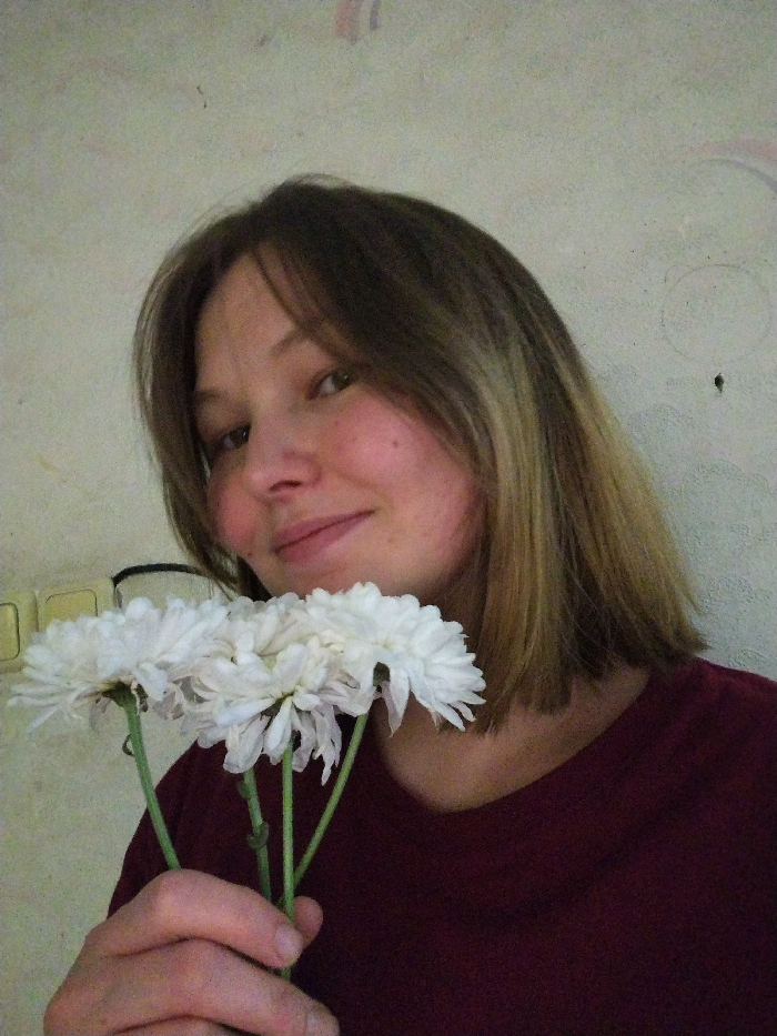A medium close-up image portrays a female individual holding white flowers indoors in Perm, Russia
