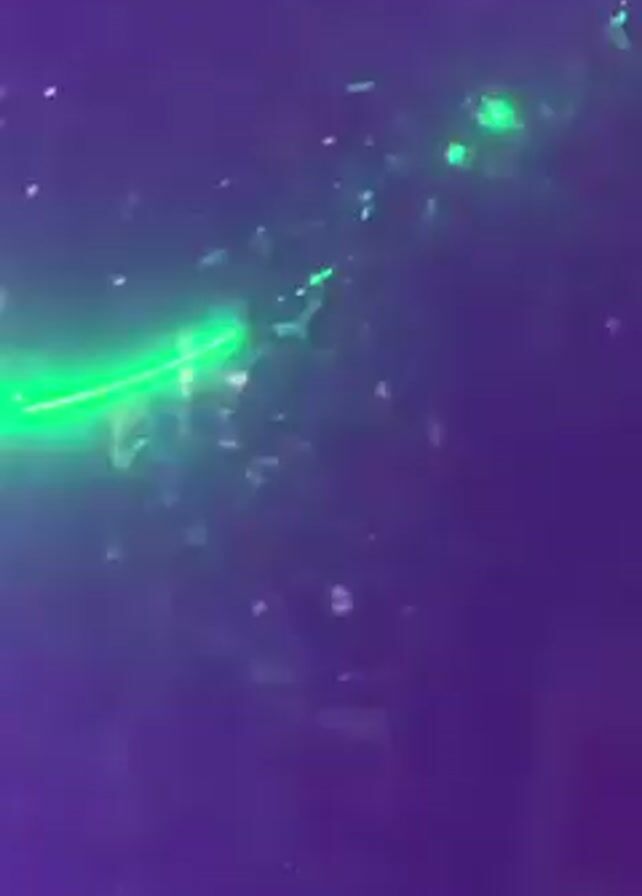 n outdoor gathering at night, possibly a party or celebration. The scene is lit with various colored lights, including purple, green, blue, and red LED strips. The lights are strung up, possibly among trees or other structures. There are silhouetted figures of people in the background, suggesting they are standing or sitting together. The overall atmosphere appears festive and dimly lit.