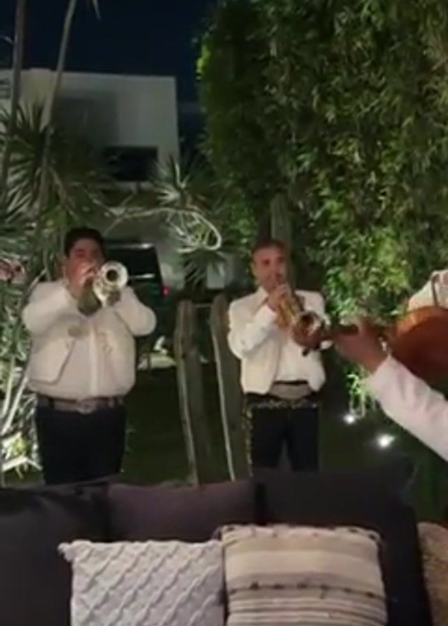 mariachi band performing outdoors at night. Three men in traditional mariachi attire, including white jackets, black pants, and embellished belts, are visible. Two are playing trumpets, while the third plays a guitar-like instrument. The band is positioned in front of lush greenery, with a house visible in the background. In the foreground, there's a patio sofa with decorative pillows. The atmosphere appears festive and celebratory.