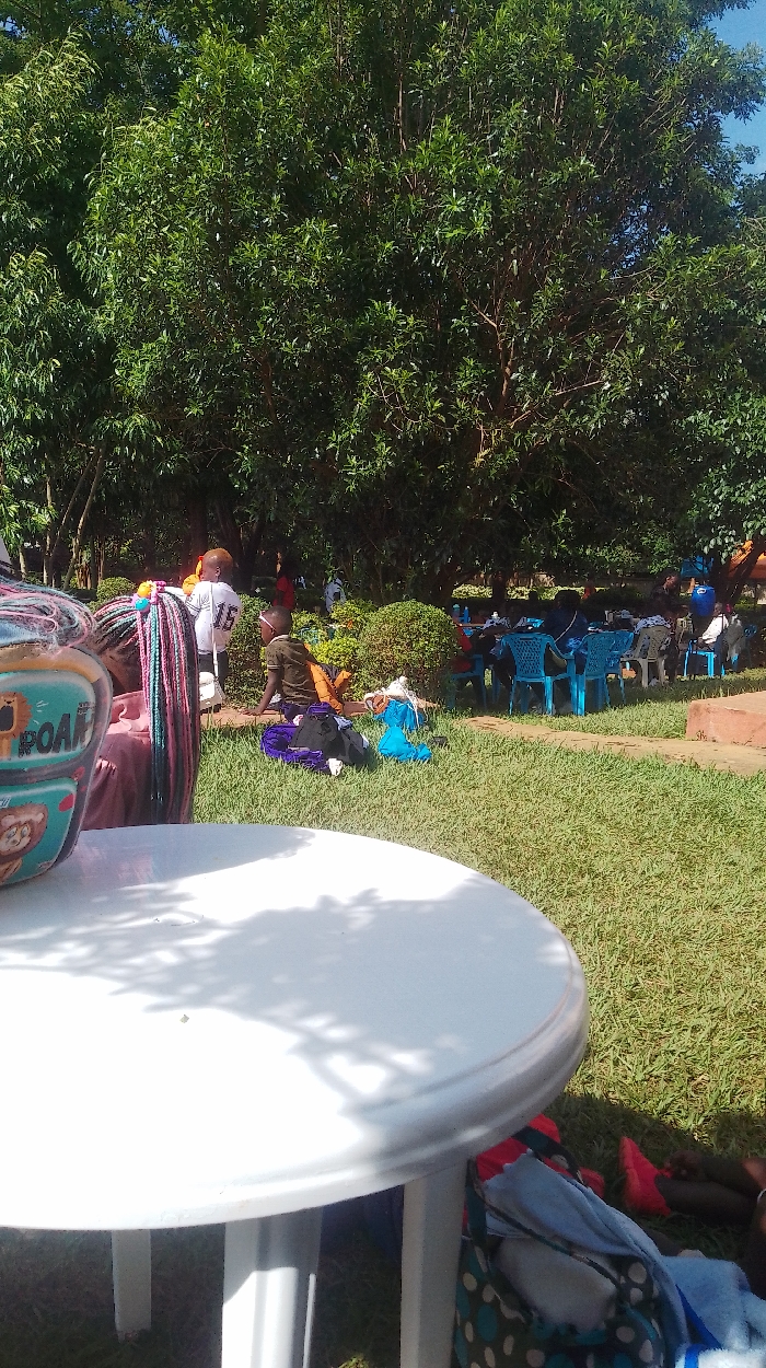 This image depicts an outdoor gathering within the Siaya Township ward, Kenya. The foreground is dominated by a white, round plastic table, its surface marked by tree shadows. On the table's left edge rests a metal container adorned with cartoon animal motifs, including a lion and monkey, with the word "ROAR" visible. In the lower right, a red shoe and a section of a polka-dotted bag are visible on the grass. In the mid-ground, a person with distinctive multi-colored braided hair (pink, blue, purple strands) is partially seated on the left. Centrally, a child wearing a dark shirt and sunglasses is seated on the green grass, with a purple fabric item and other scattered clothing and objects beside them. Behind this seated child, another individual wearing a white jersey with the number "15" on its back is standing. Further right and extending into the background, a group of people, mainly children, are seated at tables furnished with bright blue plastic chairs. Other indistinct figures are present further back. The environment features a manicured green lawn, numerous large, leafy trees providing shade, and small, trimmed bushes. Bright daylight illuminates the scene, and a reddish-brown earthen area is visible in the right mid-ground.
