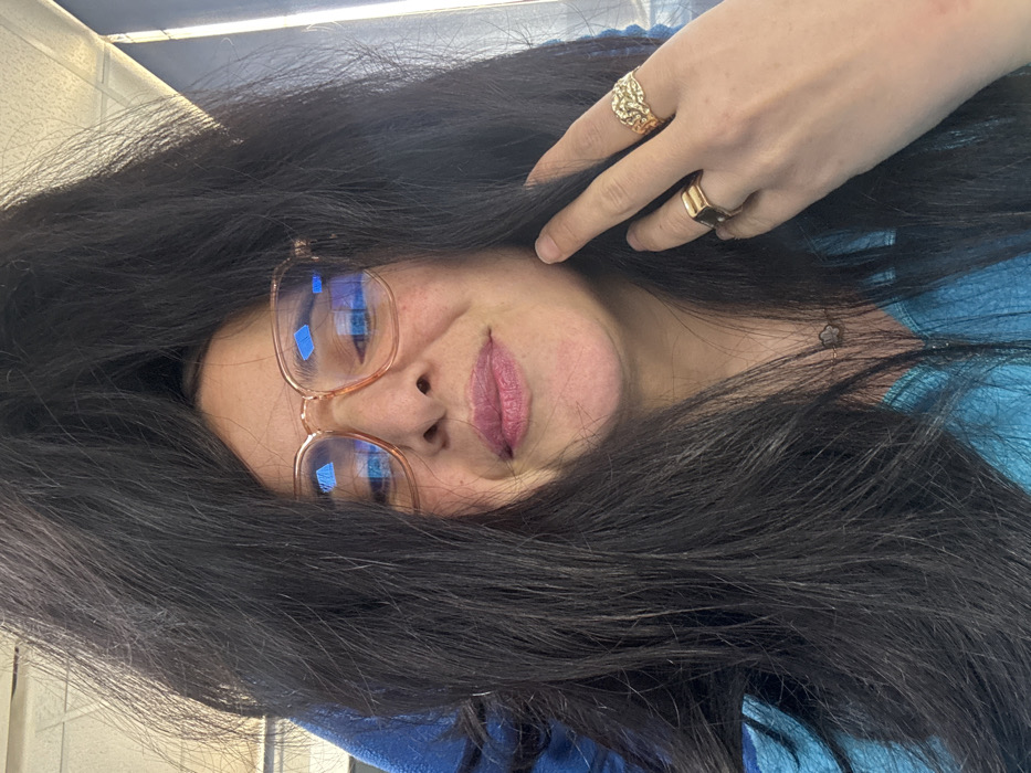 This is a close-up image of a female individual, photographed from the chest up in an indoor setting in Meknes, Morocco. The subject has voluminous, dark hair, which partially covers her forehead and frames her face. She wears light-colored, possibly translucent, eyeglasses, with distinct blue reflections visible on the lenses. Her lips are colored with a pink-mauve lipstick, and she exhibits a subtle smile. She is wearing a teal or bright blue zippered garment. A delicate necklace with a small, dark, four-leaf clover pendant is visible around her neck. Her left hand is raised, with fingers gently touching her hair near her cheek. On her left hand, she wears two gold-toned rings: a solid, rectangular signet ring on her ring finger and a wider, textured ring on her middle finger. The background is blurred, showing hints of a light-colored ceiling with overhead lighting and a blue object partially visible behind her left shoulder.