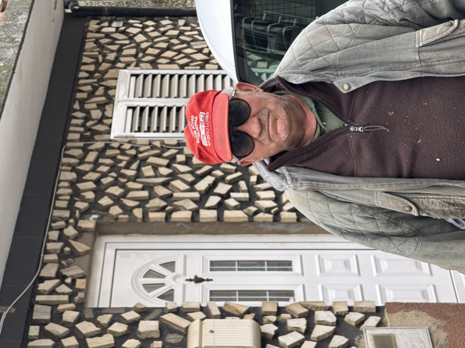An outdoor scene in Freixo de Espada à Cinta, Portugal, depicts an adult male standing in front of a residential building. The male, appearing to be in his 50s to 70s, faces the viewer directly with a neutral expression. He wears dark-rimmed sunglasses, a red baseball cap with white text that includes "VIVIR ATUAR MELHOR VOTE PPD AFONSO LOPES," a worn, quilted, olive-grey jacket, and a brown quarter-zip sweater over a green collared shirt. His short, greying facial hair is visible around his jawline. The building behind him features a distinctive facade composed of irregularly shaped, light-colored wooden blocks or stones embedded into a dark mortar base. A white, arched-top door with multiple panels and a dark metal knocker is centered in the background. To the left of the door, a light-colored rectangular mailbox is mounted on the wall. To the right of the door, a window is fitted with closed, white louvered shutters. A portion of a light-colored vehicle, possibly a van or SUV, is visible on the far right, positioned behind the man. The lighting suggests an overcast sky, providing diffused illumination.
