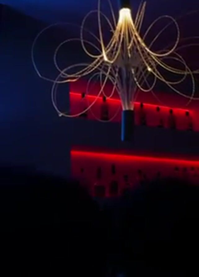 The video depicts a dimly lit bar with a modern aesthetic. A unique chandelier-style light fixture hangs from the ceiling, featuring radiating strands that glow with a warm light. Behind the chandelier is a back bar with shelves illuminated by red lights, displaying various bottles. The overall lighting scheme is predominantly blue and red, creating a moody atmosphere. Several people are visible in silhouette, their actions obscured by the low light, however, there appear to be two men near each other, possibly talking. The video seems to be captured from the perspective of someone standing within the bar, observing the scene.