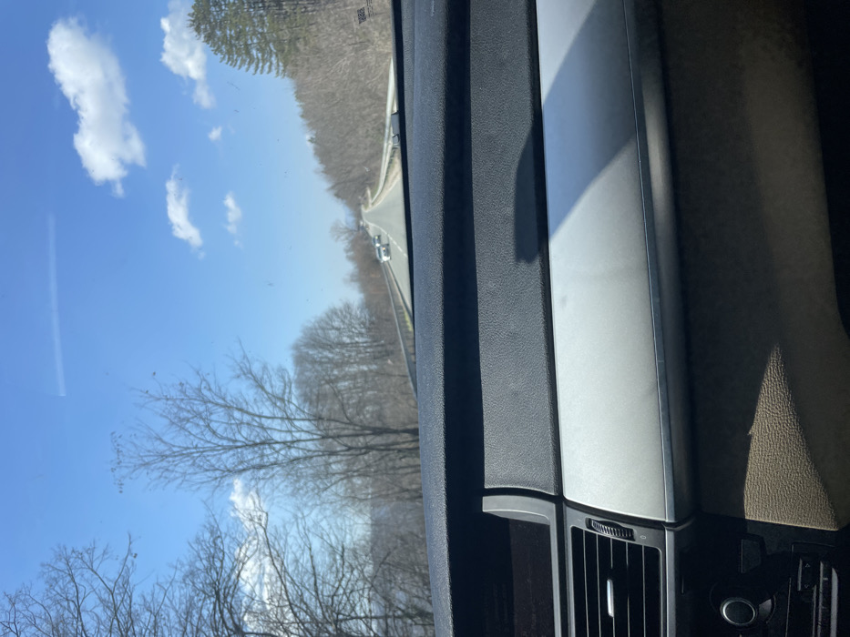 The image depicts a forward-facing view from inside a moving vehicle on a sunny day in Idilevo, Bulgaria. The foreground shows the black, textured dashboard of a vehicle, featuring a silver trim piece and a brown lower section, with part of an air vent visible on the lower left. The windshield is speckled with dirt or debris. The midground features an asphalt road, likely a two-lane highway, winding into the distance with metal guardrails lining both sides. At least three light-colored cars are visible on the road ahead, moving in the same direction as the camera vehicle. The background consists of a hilly or mountainous landscape. Bare deciduous trees, indicating a late winter or early spring season, dominate the left and center, while evergreen trees are visible on the right. A clear blue sky with scattered white cumulus clouds is visible above the tree line. No people are discernible within the frame. The scene suggests travel through a rural or semi-rural environment.