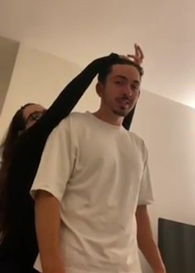 A woman with long dark hair in a black long-sleeved shirt touches the hair of a light-skinned man in a white t-shirt and red shorts