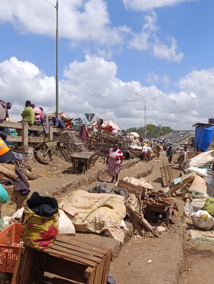 A cluttered scene depicts a makeshift market or settlement with debris, carts, and goods scattered along a dirt path. People are visible, some sitting on a bridge railing, while others walk through the area. The sky is partly cloudy, and a tall utility pole stands in the distance. The scene suggests poverty and informal economic activity.