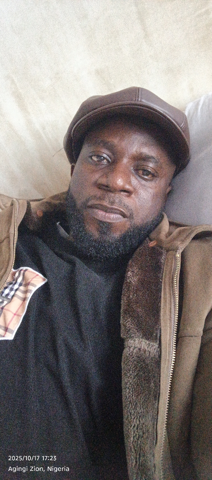 A close-up portrait shows an adult male with dark skin, a full dark beard, and a mustache, wearing a dark brown peaked cap. He is dressed in a dark-colored, long-sleeved garment underneath a tan or brown zippered jacket featuring a visible faux fur or shearling lining along the collar and front opening. A small patch of plaid fabric, consistent with a Burberry pattern (beige, black, and red), is visible on the left side of the jacket's interior or trim. The subject faces forward, looking directly at the camera with a neutral expression. The background is an indistinct, light beige or off-white textured surface, suggestive of an indoor setting. The image metadata indicates the capture date and time as 2025/10/17 17:23. The location specified is Agingi Zion, Nigeria, a locality situated within Jos, Nigeria.