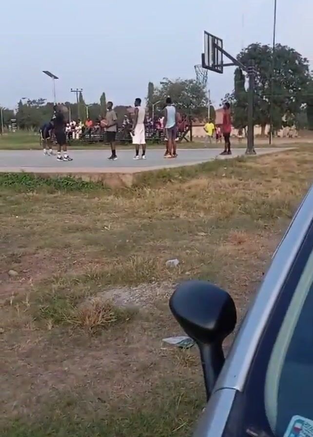 The video depicts a group of young men playing basketball on an outdoor court. The court is surrounded by grass and some trees, with a crowd of people watching the game in the background. The camera is positioned near a silver car. One player shoots the ball, and it misses. The light suggests that it is either early morning or late afternoon.