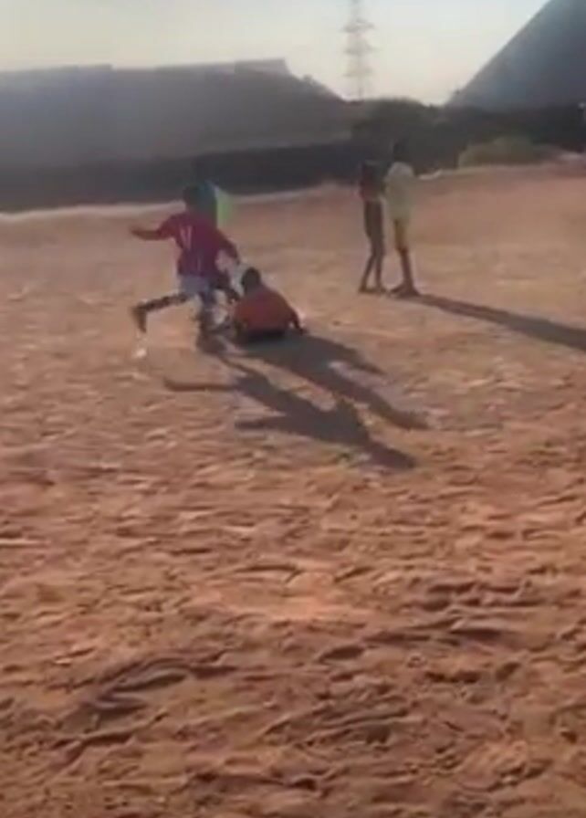 group of children on a dirt field, likely playing a game. There are six children visible, wearing various casual clothes including t-shirts and shorts. One child is on the ground, and appears to be getting up with the help of another child who is wearing a pink jersey with the number 11 on the back. Other children are standing around, seemingly observing the interaction. The field is mostly bare with some visible footprints and small debris. In the background, there are buildings and an electrical transmission tower. The scene is illuminated by sunlight.