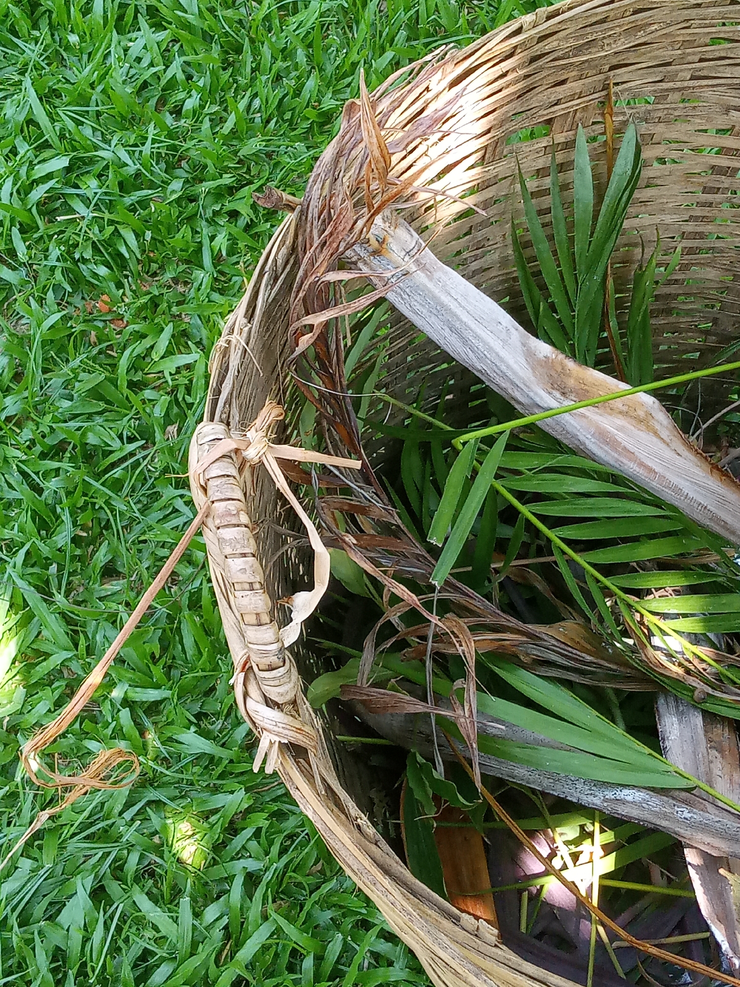 A partially broken woven basket lies on green grass