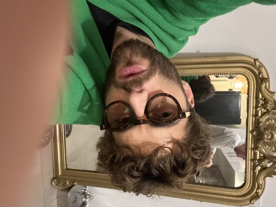 An upside-down selfie captures a person with curly brown hair, a beard, and round glasses wearing a green sweater