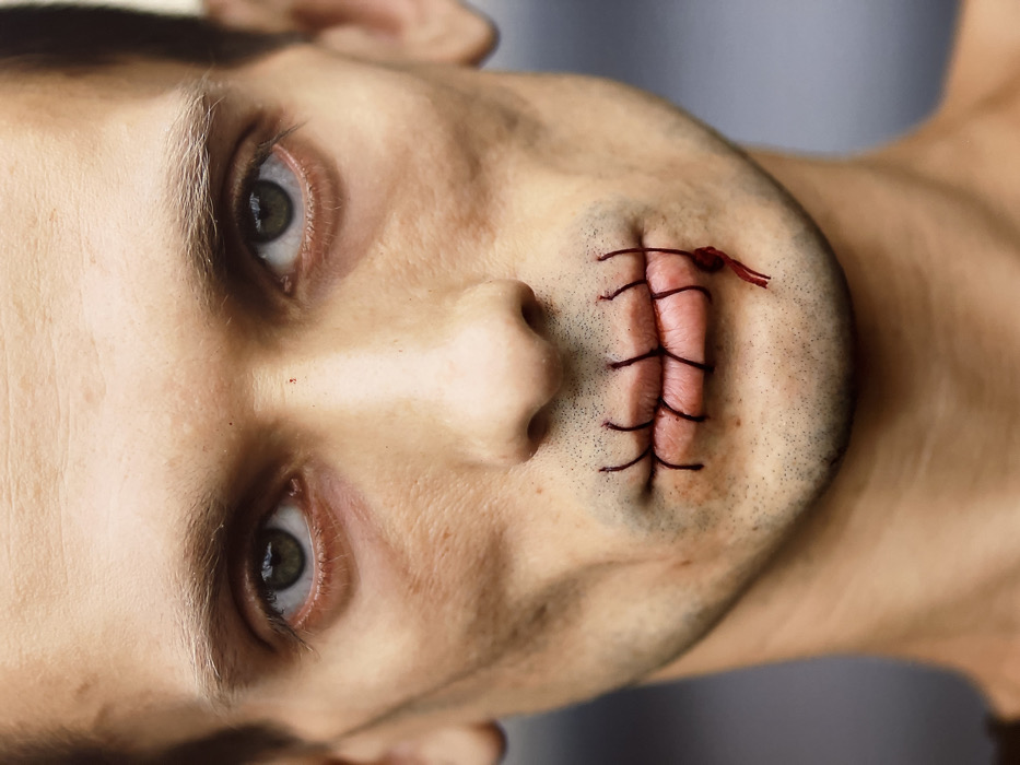 A close-up, tilted portrait shows a fair-skinned man with dark hair. His mouth is sewn shut with visible, dark stitches connecting his upper and lower lips. His eyes, a light green hue, stare intensely ahead. The background is a blurred neutral tone. The image evokes a feeling of forced silence or oppression.