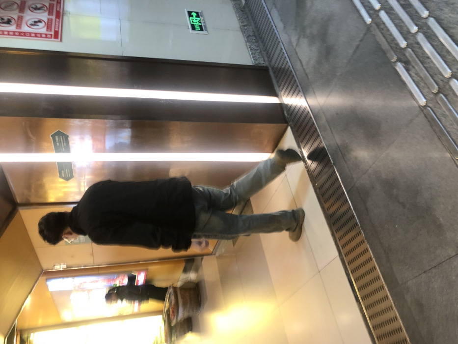 A person in jeans and a dark jacket stands in an elevator. The elevator has bright overhead lights. The exterior of the elevator features a metal grated edge. Outside the elevator, tactile paving is visible on the ground. Reflections of people and objects are visible on the elevator's mirrored walls. A sign with pictograms is placed above the elevator.
