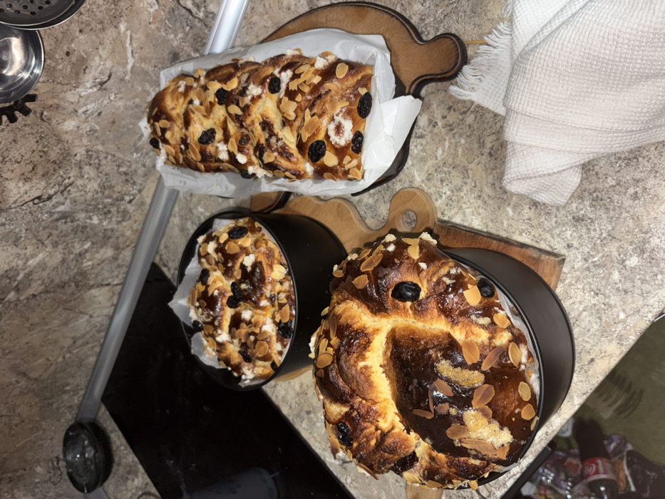 The scene is a kitchen countertop in Dve Mogili, Bulgaria. Three freshly baked sweet breads are arranged on a mottled light brown and beige granite-style counter. Two round, dark-colored baking pans contain individual large, golden-brown breads; one exhibits a distinct knot or swirl pattern. The third is a long, braided loaf, resting on a rectangular wooden board. All breads display a glossy, caramelized crust, are lined with white parchment paper, and are uniformly topped with dark raisins, slivered almonds, and granulated sugar crystals. The large round bread and the braided loaf each rest on distinct light brown wooden cutting boards with shaped handles. A folded white, textured towel is positioned in the lower right foreground. The background includes a dark induction cooktop on the left, a small dark bowl, and partially visible stainless steel kitchen utensils on the upper right, situated above a light gray backsplash trim. No individuals are present.
