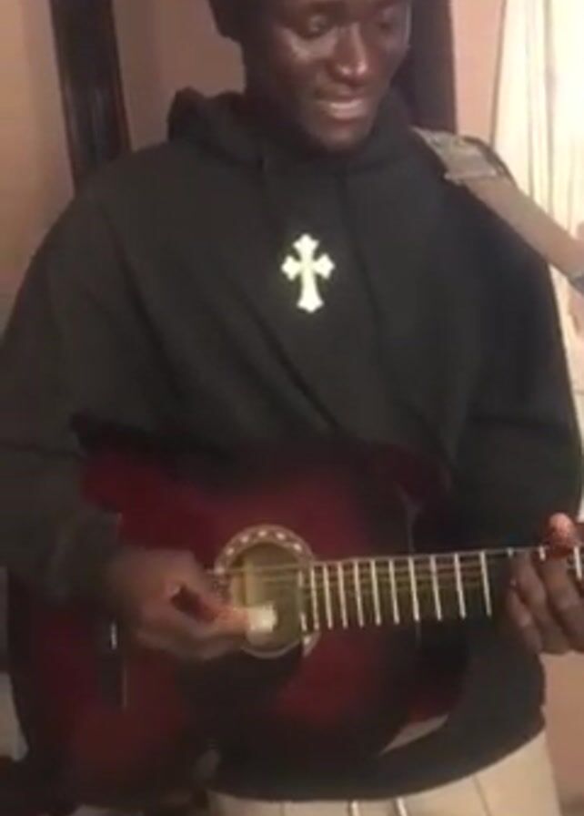A person is standing and playing an acoustic guitar. The person is wearing a black hoodie with a white cross design and a black beanie with red and white text. The guitar is red-brown in color and has a strap. The person is smiling and appears to be singing. The background is a wall painted a light color and a partially visible dark-colored door frame.