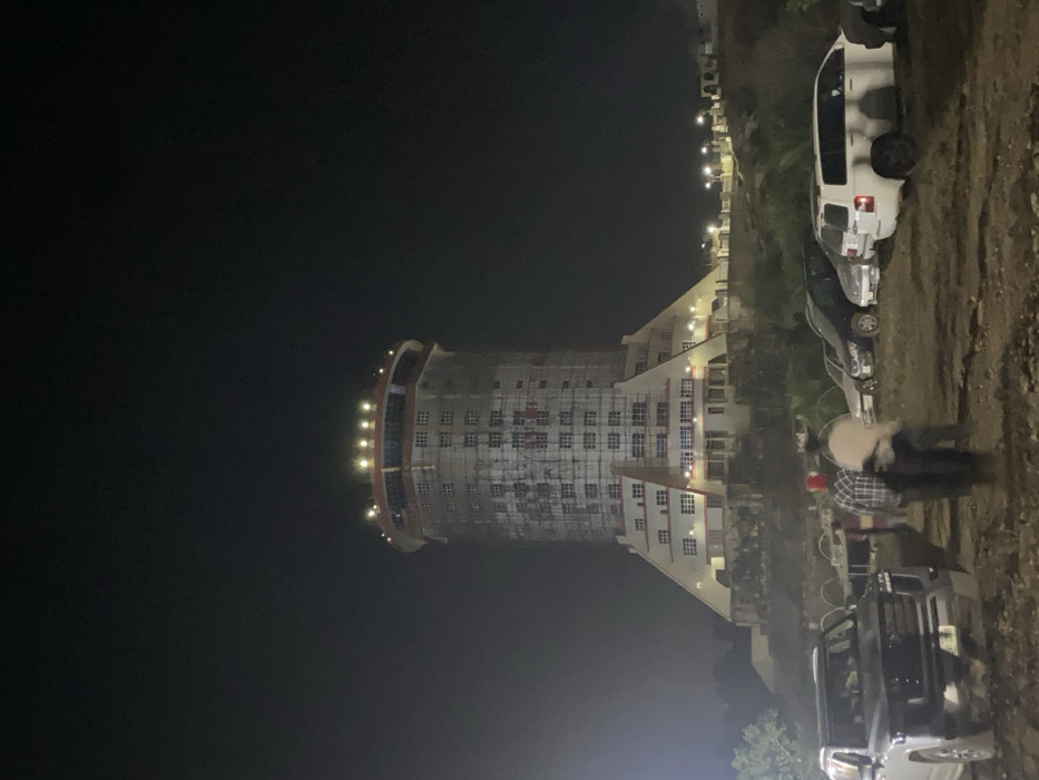 A nighttime shot reveals a tall, uniquely shaped building illuminated with rows of windows. The central structure is cylindrical and expands upwards, featuring scaffolding. Adjacent sections extend outwards with a more traditional architectural style. Several parked cars line the edge of the scene, while blurred figures move in the foreground. The dark sky provides a stark contrast to the artificial lighting of the building and surrounding area.
