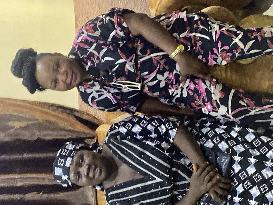 Two adult women are seated side-by-side indoors in the city of Du, Nigeria