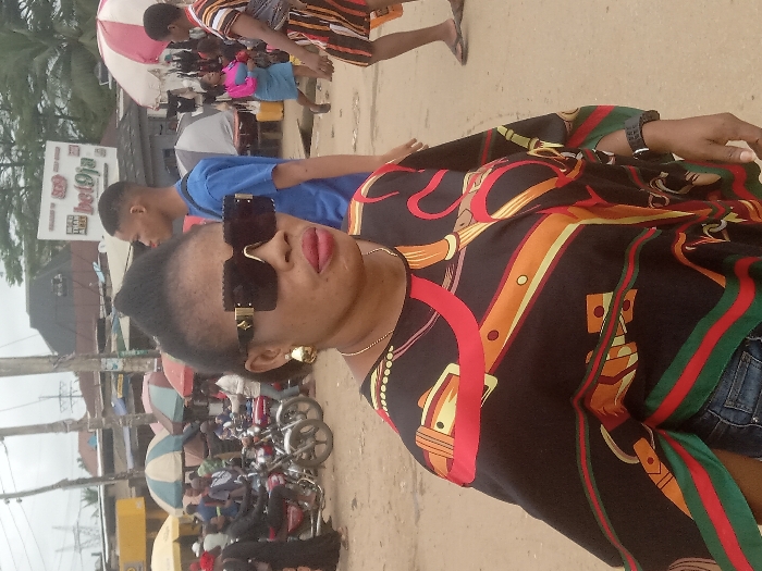 The image depicts an outdoor market street in Ura Nta Umuarandu, Nigeria, under an overcast sky