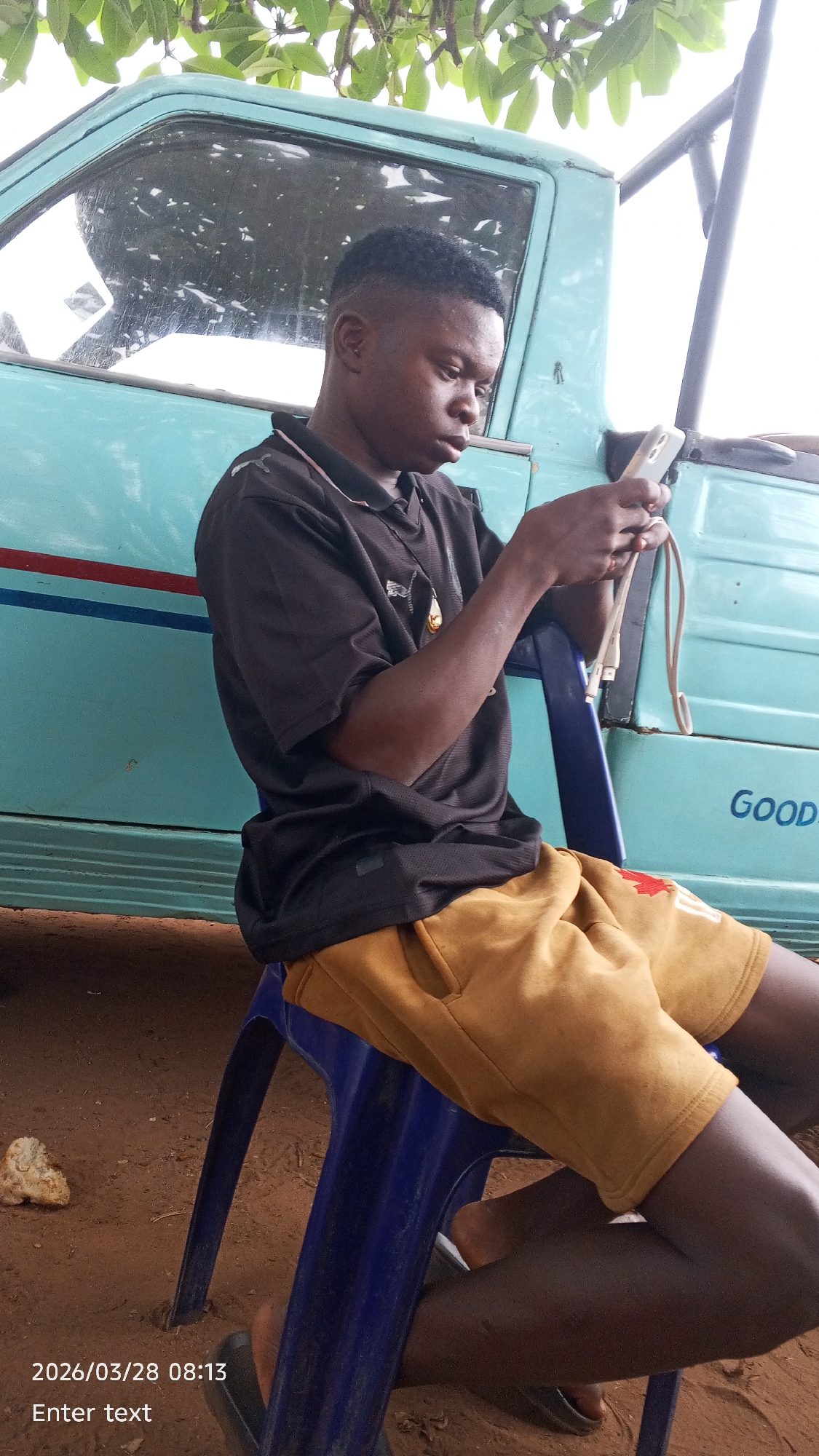 An African youth is seated on a blue plastic chair, focusing on a smartphone. He is dressed in a dark polo shirt and brown shorts. Beside him is a blue and white vehicle, partially obscured by tree branches. The ground is reddish-brown. A date stamp in the lower-left corner reads "2026/03/28 08:13." The location is Ojapata, Nigeria.