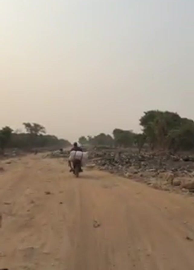 dirt road with piles of debris and trash on either side. A person on a motorbike with a large, white bag strapped to the back is traveling down the road. There are a few trees scattered along the sides of the road, and the sky is hazy. The person on the motorbike is the main subject of the video, and their movement is the primary action.