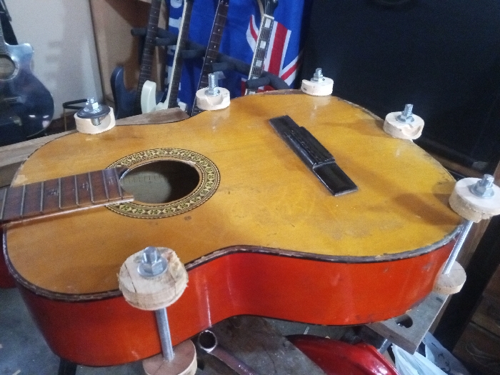 A damaged, light orange classical guitar is the focus, featuring a separated fingerboard and a partially detached bridge. The guitar's body has a red rim and a circular soundhole with decorative borders. It's secured with homemade clamping devices, consisting of wooden blocks, bolts, and washers, strategically placed to apply pressure for repair. The background shows other guitars, a rack, and a British flag, indicating a cluttered workshop or repair area.