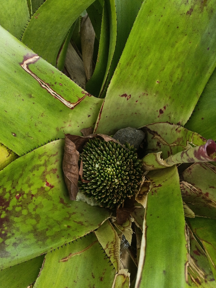This close-up, overhead image captures the central rosette of a bromeliad plant located in São Félix do Xingu, Brazil. At the core of the plant, a dark green, spiky, spherical structure, approximately 6-8 cm in diameter, is prominent. This structure is enveloped by multiple broad, strap-like green leaves radiating outwards. The leaves exhibit various markings, including irregular reddish-brown spots and distinct linear, raised patterns with reddish-brown borders. Some leaf edges display serrations. A single dark grey rock is visible nestled among the leaves to the upper right of the central spiky object, accompanied by fragments of dried brown foliage. No animate subjects, human actions, or interactions are present within the scene.