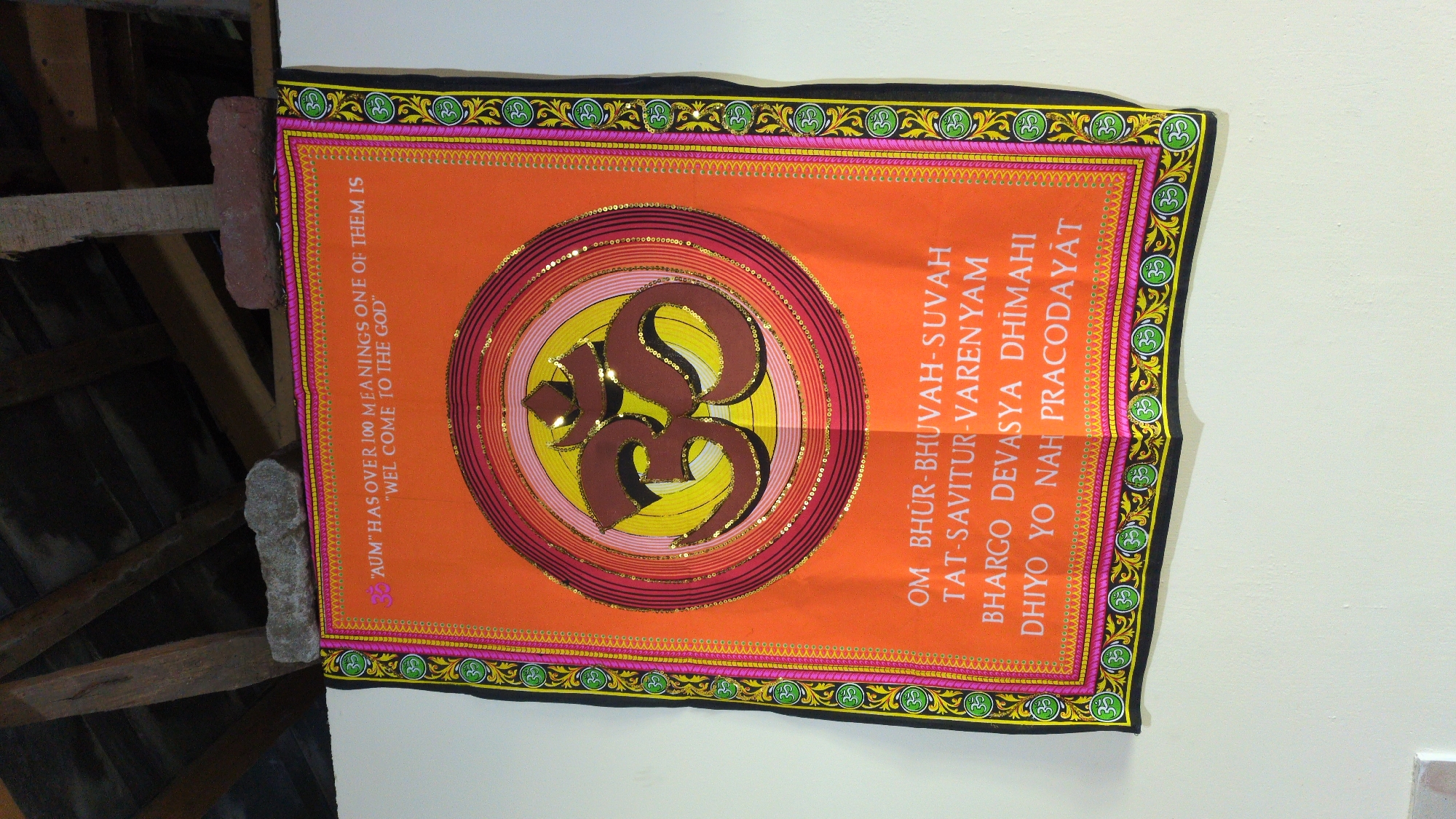 rectangular orange cloth hung on a white wall with an image of the Om symbol and accompanying text