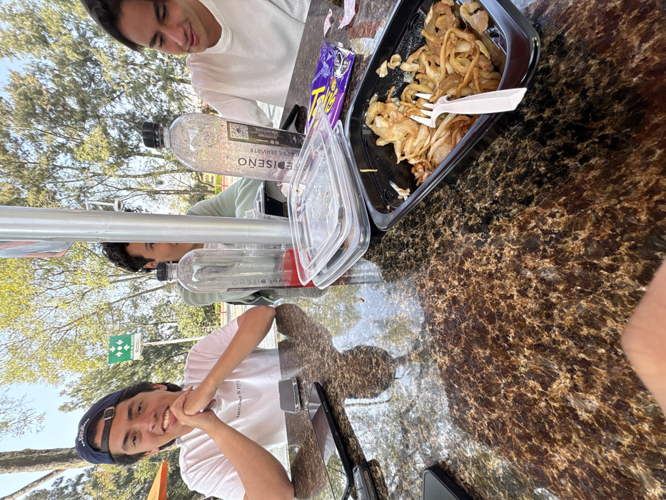 Three young men sit around a table on a sunny day. A black container holds noodles with a white plastic fork. A purple bag of Takis is beside it. There are two empty water bottles with labels visible. Also, an empty clear container lies near the noodles. The table's surface is a dark brown mottled pattern. A cell phone and a car key are visible beside the man in the baseball cap. Trees and blue sky are in the background.