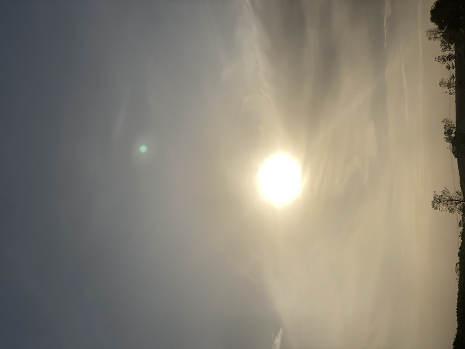 A daytime outdoor shot features a bright, sun-drenched sky with a visible sun and lens flare. Clouds are scattered across the sky, thicker towards the horizon where some trees are visible, silhouetted against the intense sunlight. The overall tone is hazy and bright.