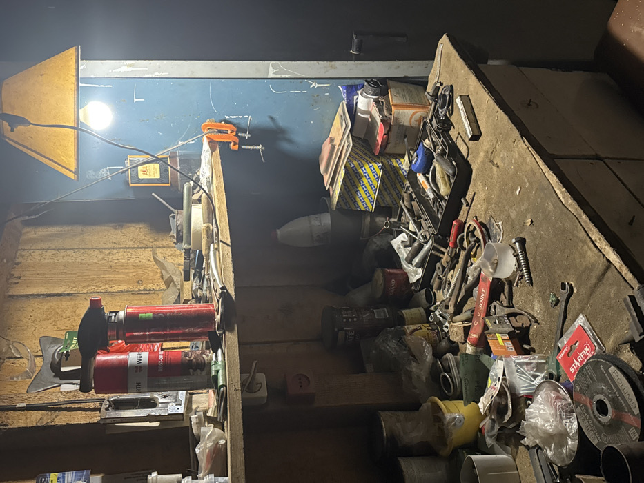 This image captures a cluttered workshop or utility room located in Klichaw, Belarus